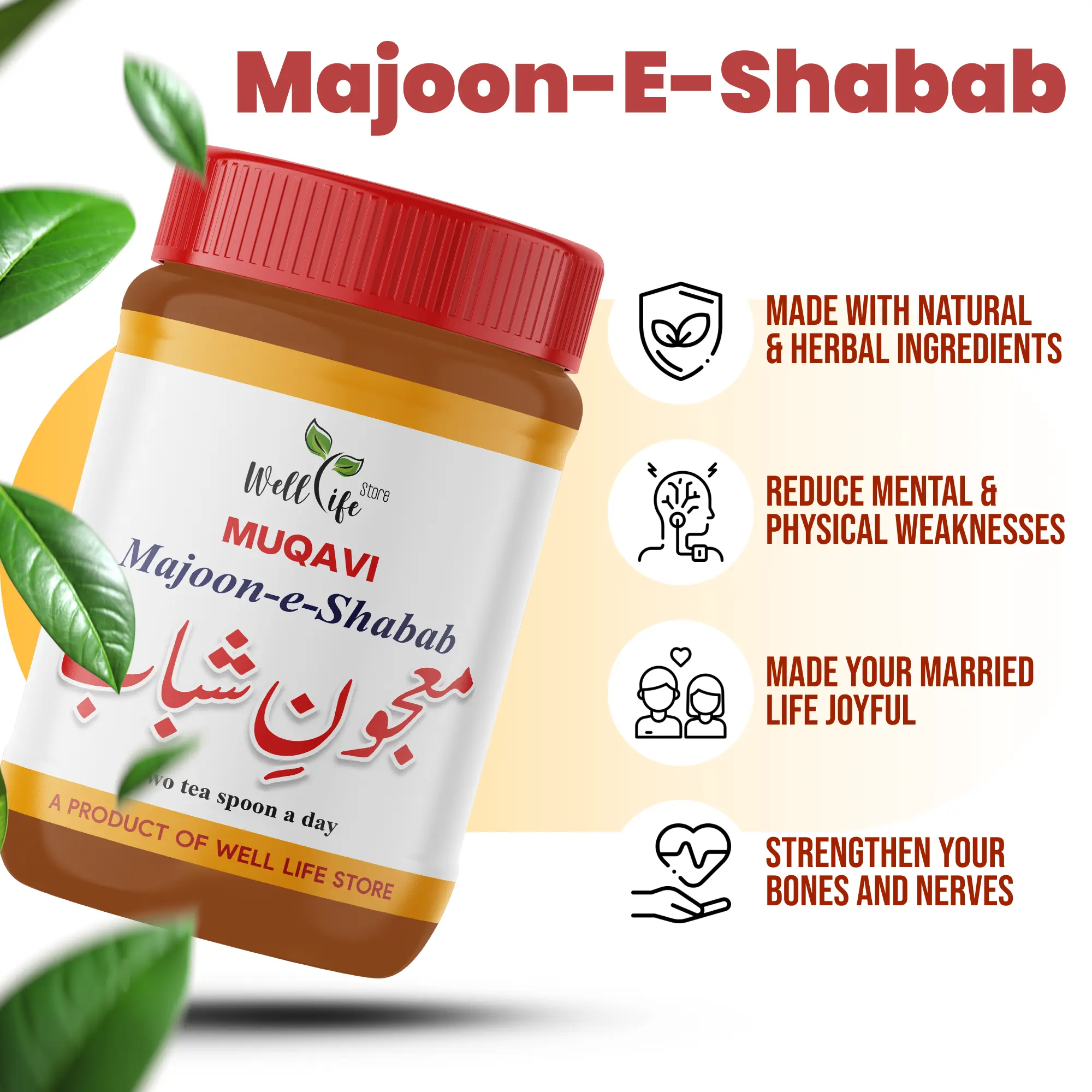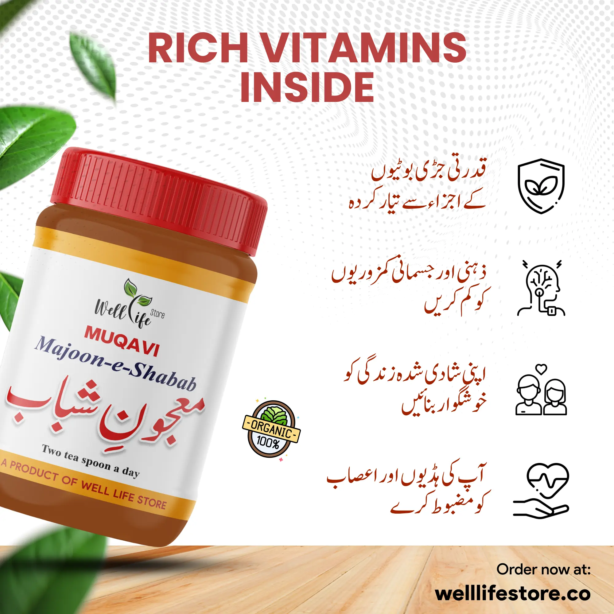 Majoon e Shabab is a comprehensive food supplement that provides essential nutrients necessary for your daily routine. It aids in replenishing vital vitamins and minerals like Vitamin A, B1 (Thiamin), B3 (Niacin), B6, C, E, and Folate, supporting your overall well-being.